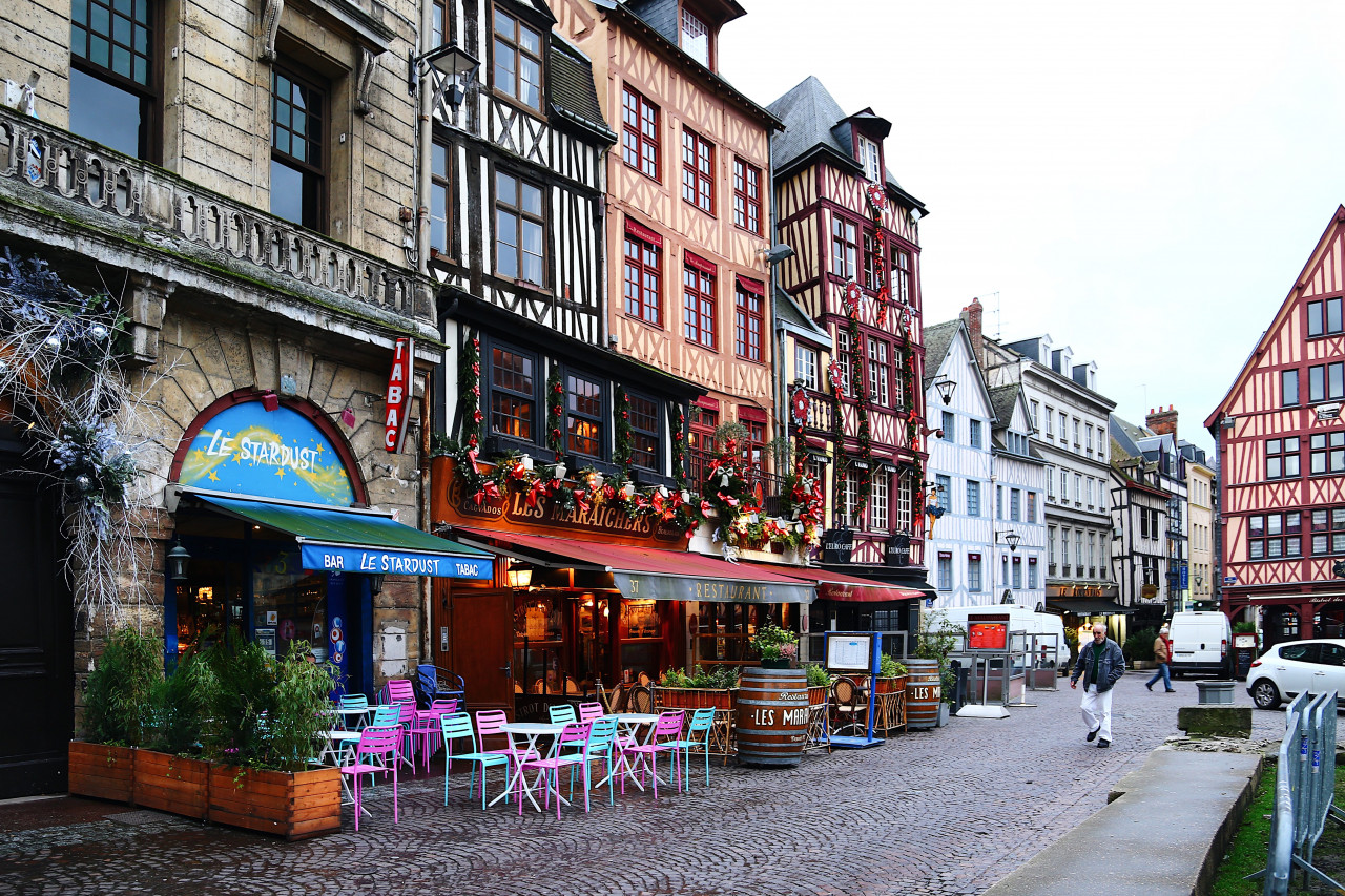 在前往鲁昂的途中。早上在距离大城市几公里处的圣皮埃尔-德于米耶日修道院稍作停留。这座诺曼罗马式建筑的瑰宝,在19世纪被毁后仅存遗迹,非常值得一游。它由征服者威廉(William the Conqueror)创建,经受住了时间的考验,后来法国大革命改变了它的命运,将其变成了采石场!圣女贞德的命运也被残酷地写在了鲁昂,她在这里被活活烧死。推开位于大主教宫殿内的《圣女贞德历史陈列室》的大门,里面讲述了法国著名处女的故事。下午继续游览老城。