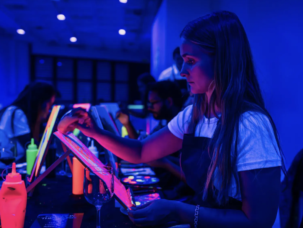 在里昂与众不同的创意工作室Neon Brush,您可以一边喝着开胃酒,一边在黑暗中作画!在这里,颜料是磷光的,您可以一步步欣赏自己的杰作。您一定会沉浸在一个充满艺术气息、100% 荧光的世界里,与您的伙伴或朋友度过一段美好时光。无论您是绘画高手还是初学者,我们都欢迎您的到来。在一个半小时的时间里,您可以在艺术家的指导下,边喝小酒边用画笔作画。结果往往令人捧腹,总是出人意料。现在,您已经准备好参加一项难得一见的非同寻常的活动了!