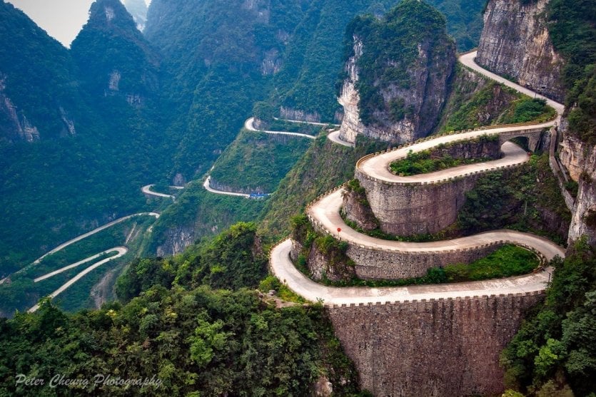 在长达 11 公里的路程中,有 99 个弯道,其中有些弯道呈 180°,眩晕感是肯定有的,如果您想心平气和地走这条路,最好有一颗强大的心脏!天门路也被称为 "通天之路",沿途要经过两座大桥,周围的九座山峰、陡峭的悬崖和古老的树木尽收眼底。沿着天门路走一圈,四十分钟的惊险之旅令人难忘。此外,在中国湖南省北部的天门山顶,还有一个巨大的收获,那就是海拔 1200 米的天然天坑--天门洞。
